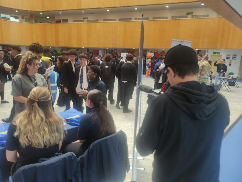 We began in the sports hall, capturing the buzz of their Careers Networking Fair. Students met representatives from local employers such as Savills, Smart Managed Solutions, the NHS, Fire Service and various universities to learn about further and higher education and opportunities for work experience.